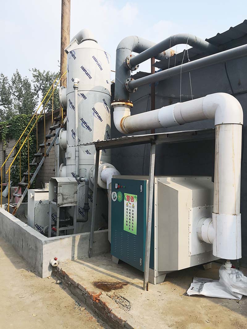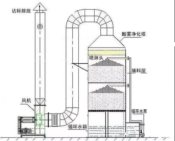 工作原理:廢氣凈化噴淋塔主要的運(yùn)作方式是廢氣由風(fēng)管引入凈化塔,經(jīng)過填料層,廢氣與氫氧化鈉吸收液進(jìn)行氣液兩相充分接觸吸收中和反應(yīng),廢氣經(jīng)過凈化后,再經(jīng)除霧板脫水除霧后由風(fēng)機(jī)排入大氣。吸收液在塔底經(jīng)水泵增壓后在塔頂噴淋而下,然后回流至塔底循環(huán)使用。凈化后的廢氣達(dá)到地方排放標(biāo)準(zhǔn)的排放要求,低于國(guó)家排放標(biāo)準(zhǔn)。